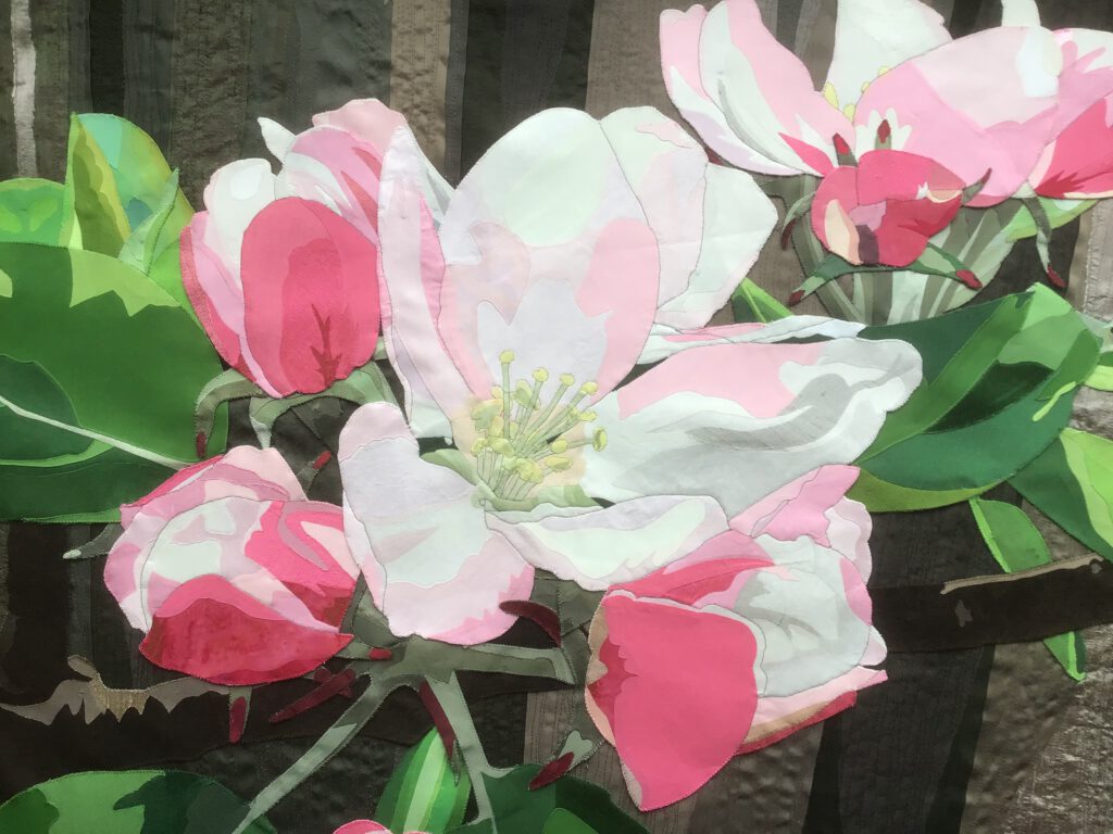 5 december 2025. De tulpen voor de masterclass zijn af. Geen foto nu, het blijft nog even geheim tot de expositie in mei ‘26. Nu aan de collage voor Zoo-Tex bij Downeys. Dit wordt een appelbloesem tegen een schutting met nog een verrassing. Soms denk ik dat ik wel wat ver ga met kleuren en details: voor een knop met jonge blaadjes en een al uitgekomen blad heb ik 35 verschillende kleuren groen gebruikt, de meeste natuurlijk als heel kleine stukjes. Een heel gepuzzel om ze straks goed op hun plek te krijgen, maar dan ben ik vast heel blij met het resultaat.