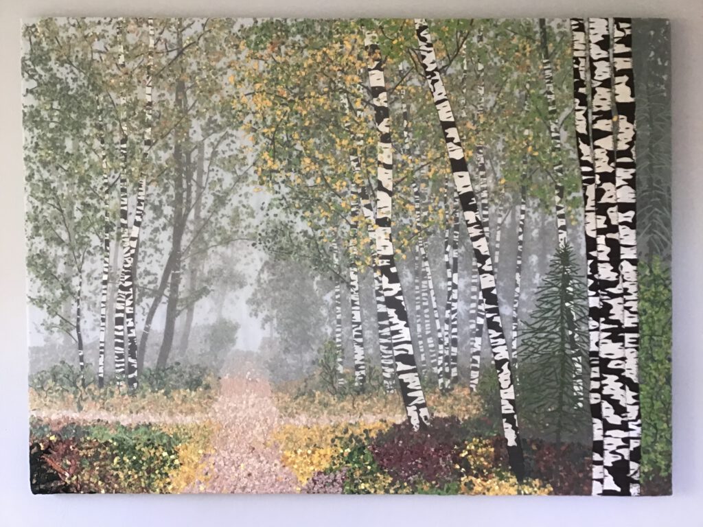 Schilderij (2019). 100 x 160 cm. Opdracht, naar een schilderij in bezit van van de opdrachtgever; het ontwerp aan beide zijkanten uitgebreid. Diverse stoffen.Berken. (2019) 93 x 119 cm. Verkocht; voorgrond bomen van zijde, andere van organza en andere stoffen. bodem confetti- techniek, meerdere lagen onder bruidstule.